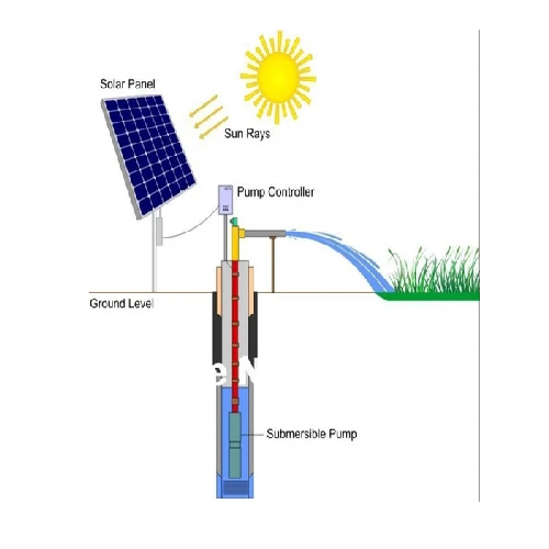 A type of water pump that operates submerged in water (e.g., in a borewell, well, or pond) and is powered directly by solar panels, eliminating the need for grid electricity or diesel generators.